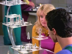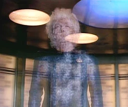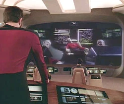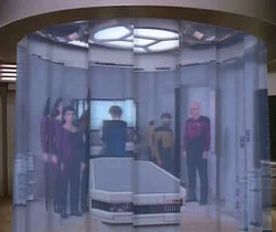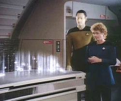 Cestou se doktorka kapitána vyptává, co by se stalo, kdyby se to nepodařilo, Odpoví jí, že by v tomto případě byla její energie vyslána do vesmírného prostoru. Doktorka to doplní slovy, že její atomy by byly rozptýleny po celé Galaxii. Kapitán se za to chce omluvit, ale Pulaski jej zastaví a upozorní ho že, když cestuje tou věcí, je si vždy jistá, že právě tohle se stane.