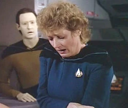 Dat s Rikerem začínají hledat vzorek tkáně nebo cokoliv, co by obsahovalo DNA doktorky Pulaski. V dokumentaci však nic nenacházejí. Čekají na dokumentaci, která jim byla odeslána z velitelství Hvězdné flotily. Aby se nezdržovali, navrhuje Riker, aby šli prohlédnout její kajutu. V kajutě je napadne hledat její hřeben, což se mu v koupelně podaří. A Dat z hřebenu vytahuje vlas i s vlasovým kořínkem, tedy živé buňky.