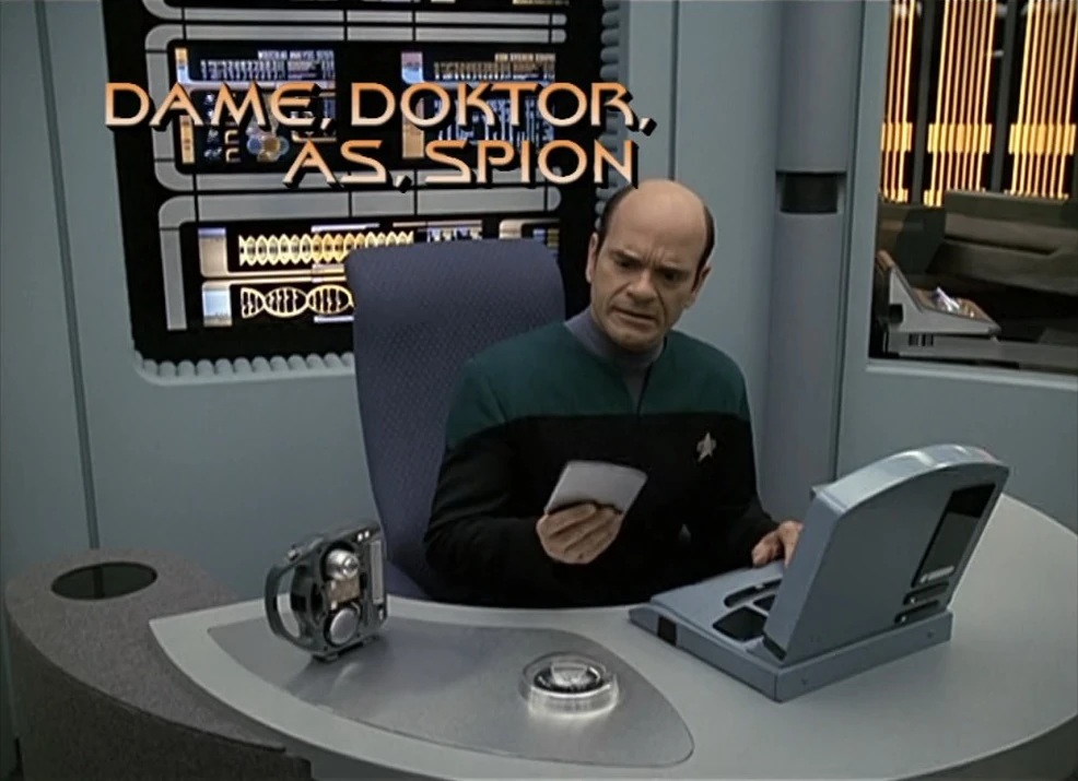 Der Doktor wird nervös, weil er kurz davor steht auf dem Stuhl des Captains zu sitzen. Kim beruhigt ihn auf der Krankenstation, da ihm der Sessel auch riesig vorkam, als er das erste Mal darauf Platz nahm.