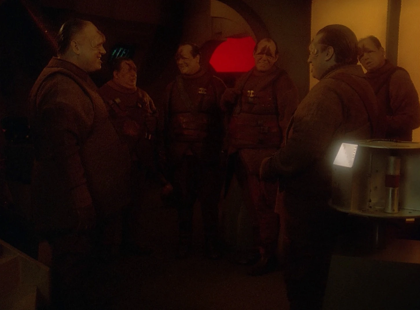 Riker ordnet eine Besprechung der Führungsoffiziere an. Pulaski äußert, Geordi brauche aufgrund der Phaserbeschüsse medizinische Hilfe. Worf hält ein Sicherheitsteam bereit. Data reduziert die Wahlmöglichkeiten auf das Eingehen der Forderungen einerseits und auf die Anwendung von Gewalt andererseits. Riker hält ein Eingehen auf die Forderungen für unmöglich, Worf will deshalb Gewalt anwenden.