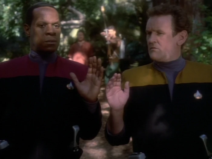 Sisko und O'Brien beamen in einen Wald. Sofort versuchen sie mit dem Tricorder die Gegend zu scannen, doch beide Geräte funktionieren nicht. Daraufhin verwendet Sisko sein Kommunikationsabzeichen, um die Rio Grande zu kontaktieren, allerdings antwortet der Computer nicht. Auch der Phaser, den der Chief bei sich trägt, hat keine Funktion. Zudem kann er keinerlei elektromagnetische Aktivität feststellen. Das verwundert die beiden und sie haben keine wirkliche Erklärung dafür. Alles was dem Chief einfällt, wäre das duonetische Feld, das er zuvor registriere. Daraufhin erklärt Sisko, dass er hofft, es finden sich noch ein paar von O'Briens Talenten, bevor sie in ernsthafte Schwierigkeiten kommen könnten. In diesem Moment ist eine Stimme zu hören. Sie fordert die beiden auf, stehen zu bleiben. Dann sollen die beiden die Hände nach oben nehmen.