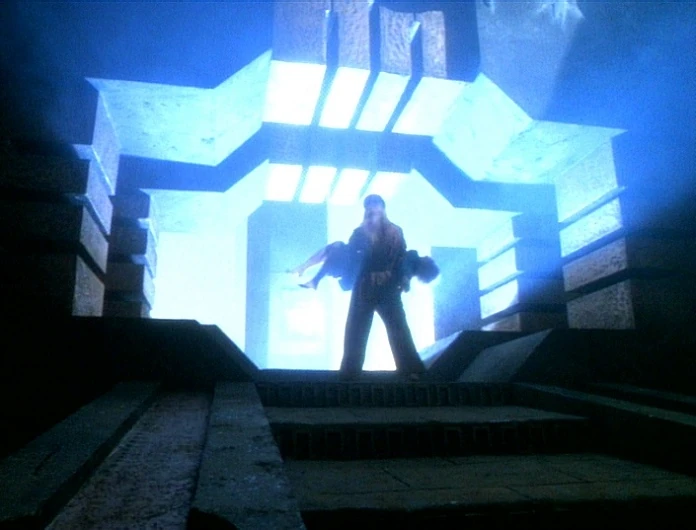 Janeway fragt nach, ob sie hier für immer warten sollen. Doch die Männer betonen, dass sie hier nur warten. Janeway stellt fest, dass die jungen Mönche im Tempel nicht lange warten mussten, um das Feld durchschreiten zu können. Janeway meint, das sei ein Test und versucht die Tür am anderen Ende des Raumes zu öffnen. Die Personen antworten ihr, dass sie hier lediglich warten und laden Janeway ein, sich zu ihnen zu setzen und zu warten. Janeway besteht jedoch darauf einer Freundin zu helfen. Ein Mann meint, dass Janeway genau weiß, was sie tun möchte. Der Captain versucht nun die Tür zu öffnen. Als ihr dies nicht gelingt, klopft sie an die Tür und die Führerin öffnet ihr. Janeway meint, dass sie das Ritual gerne fortsetzen würde und geht mit der Führerin weiter.