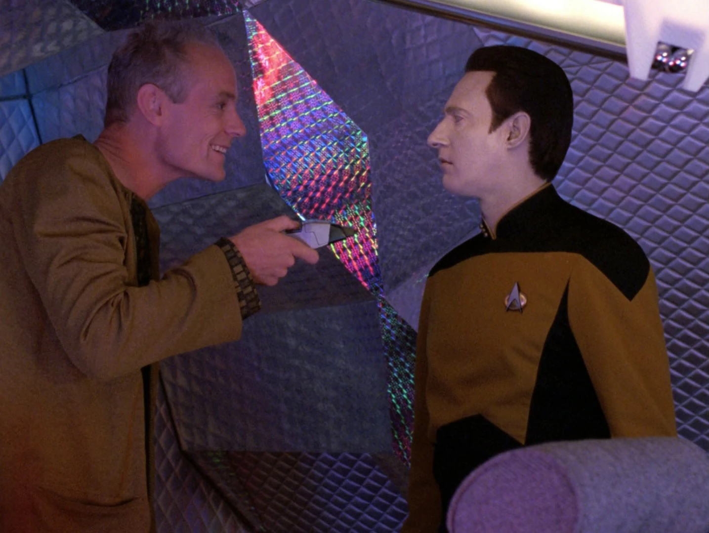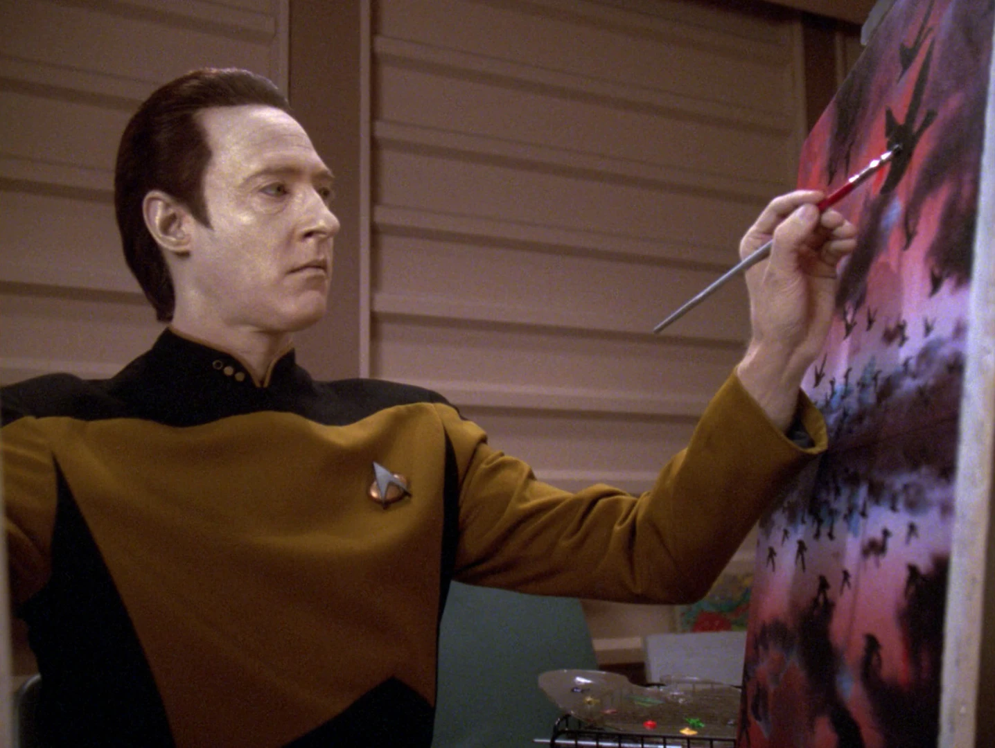 Als Data aktiviert wird, machen ihm die Offiziere klar, dass dieser eine Maschine ist, doch Data erkennt, dass mehr in ihm steckt und er beginnt den Menschen nachzueifern, um sich weiterzuentwickeln. (TNG: Der rechtmäßige Erbe)