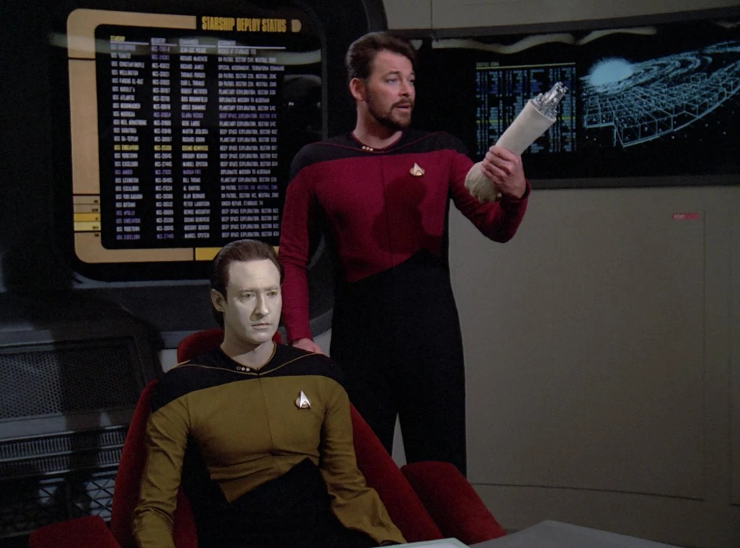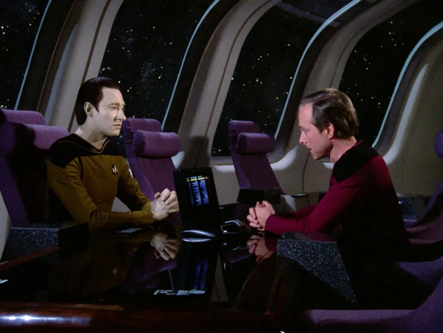 Da Data der Sternenflotte dankbar für seine Rettung ist, will er einen Teil zurückgeben und will als Offizier in der Sternenflotte dienen. Als sich Data bewirbt, stimmt eine Kommission ab, ob dieser als Androide beitreten darf. Alle mit Ausnahme von Bruce Maddox stimmen für Datas Eintritt in die Sternenflotte. (TNG: Wem gehört Data?)