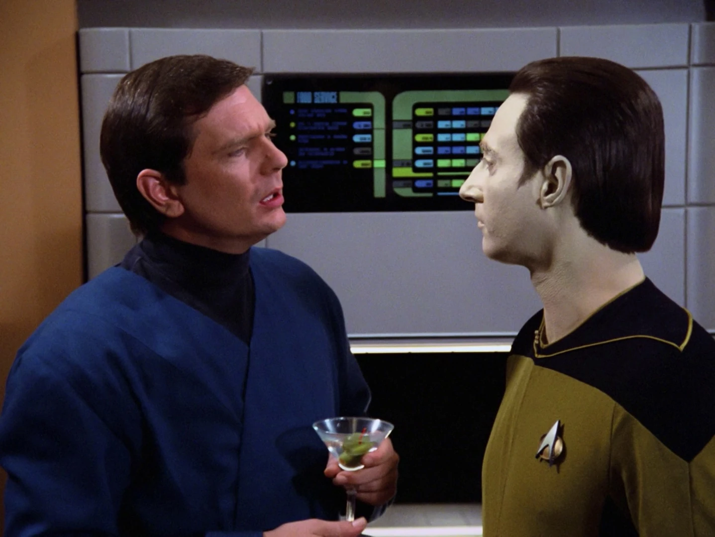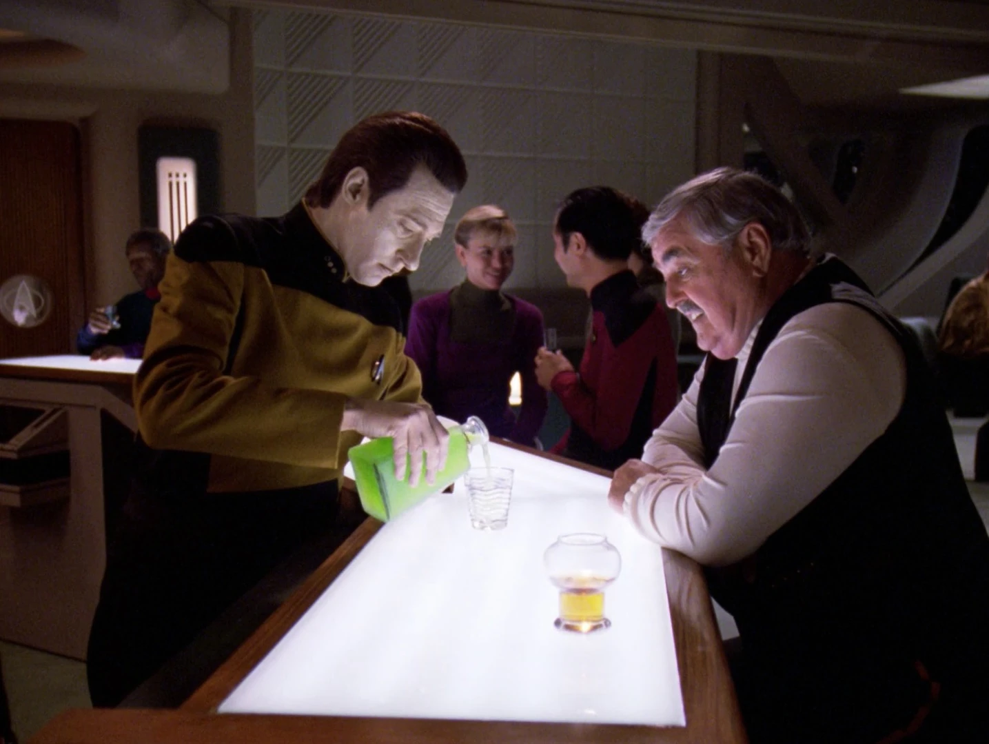 Data probiert ein Getränk von Guinan