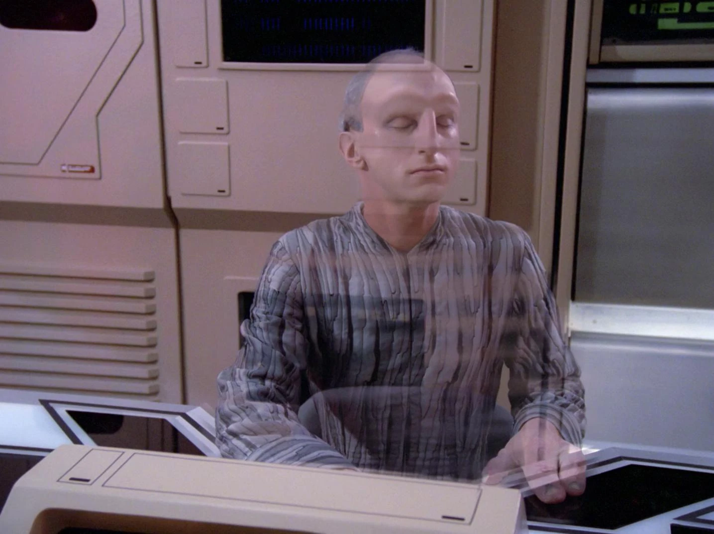 Mit Troi alleine zurückgelassen, stellt Riker fest, dass Kosinski auffallend schlechte Stimmung verbreite. Troi erweitert seine Charaktereigenschaften um Arroganz, Überheblichkeit und Präpotenz. Bei dem Assistenten könne sie aber merkwürdigerweise gar nichts spüren, obwohl sie bei den meisten Lebensformen zumindest irgendeine Emotion spüren könne. Riker befiehlt ihr, weiterhin aufmerksam zu bleiben.