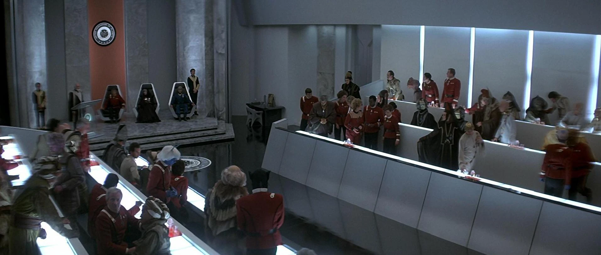 Die Beschreibung der Halle des Föderationsrats im Roman entspricht im Wesentlichen der Szene aus Star Trek IV: Zurück in die Gegenwart. Demnach bieten die zu sehenden Sitzreihen jeweils 20 Sitzplätze. Im Jahr 2380 sind es dann im Gegensatz zu der gezeigten Szene aus dem 23. Jahrhundert jeweils vier Reihen. Derzeit also 160 Sitze für 155 Mitglieder. Sobald das 161. Mitglied der Föderation beitritt, werden diese auf beiden Seiten um je eine Reihe erweitert, um die Symmetrie aufrecht zu erhalten.