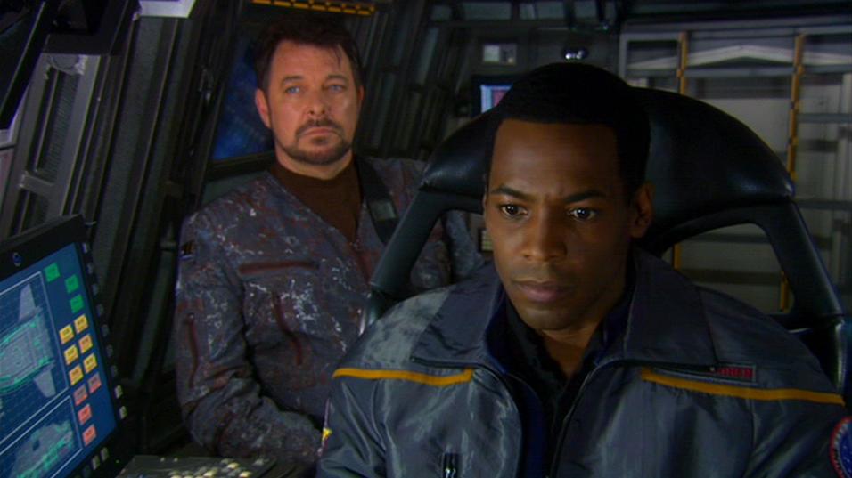 Riker, der sich im Holodeck gerade auf der Brücke der Enterprise NX-01 befindet, wird auf die Brücke der Enterprise D gerufen (Alle Führungsoffiziere bitte auf der Brücke melden!). Allerdings wird dieser Satz ebenfalls von Rikers Synchronstimme Detlef Bierstedt gesprochen – Riker ruft sich also selbst.