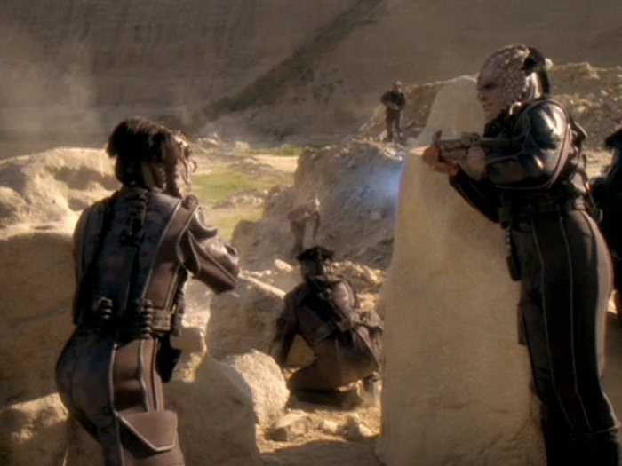 Der Schusswechsel zwischen den Jem'Hadar und den Offizieren der Sternenflotte geht weiter. Die Offiziere um Sisko machen sich klein und suchen hinter den Felsen Deckung. Wenn immer es ihnen möglich ist, richten sie sich kurz auf und schießen in Richtung der Klippen. Dann ziehen sie sich wieder in ihre Deckung zurück.