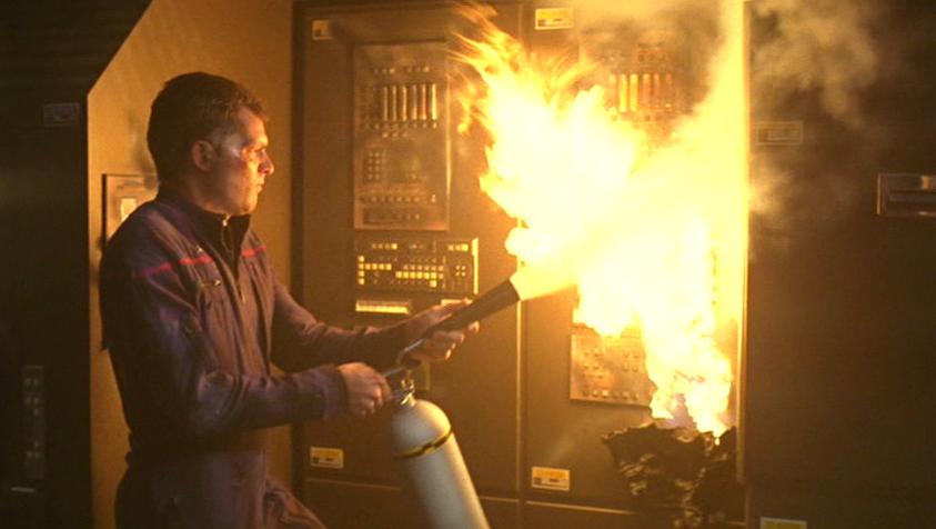 Während die USS Enterprise (NCC-1701-E) im Briar Patch unter Beschuss durch Son'a-Raumschiffe steht, brechen im Maschinenraum Brände aus. Geordi La Forge löscht diese Brände und einige Crewmitglieder mit einem Feuerlöscher. (Star Trek: Der Aufstand)