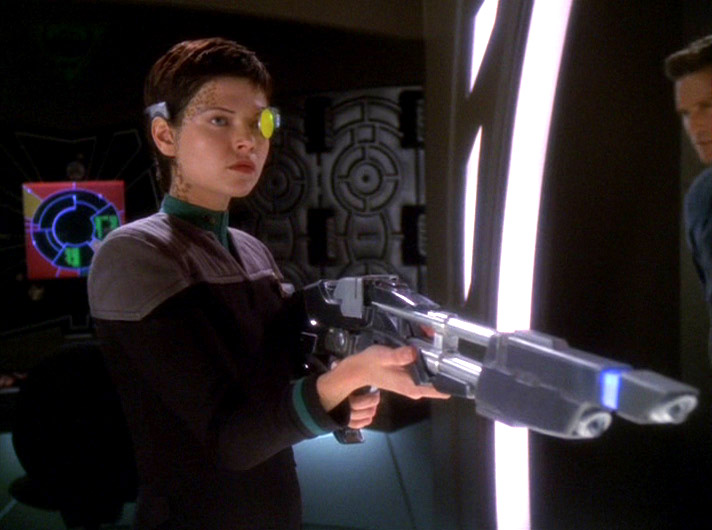 Als Ezri später in das Quartier von Chu'lak kommt, nimmt sie dessen Gewehr und zielt auf den Mann. Da sie aber weder das Zielerfassungssystem auf hat, noch das Gewehr einstellt, würde sie den Vulkanier damit nicht erschießen können. Chu'lak selbst hatte mit dem Gewehr auf Ezri im Wissenschaftslabor geschossen und der Schuss ging dort in die Wand. Somit würde ein Schuss von Ezri auf den Vulkanier bestenfalls irgendwo ins All gehen und schlimmstenfalls einen Unbeteiligten töten.