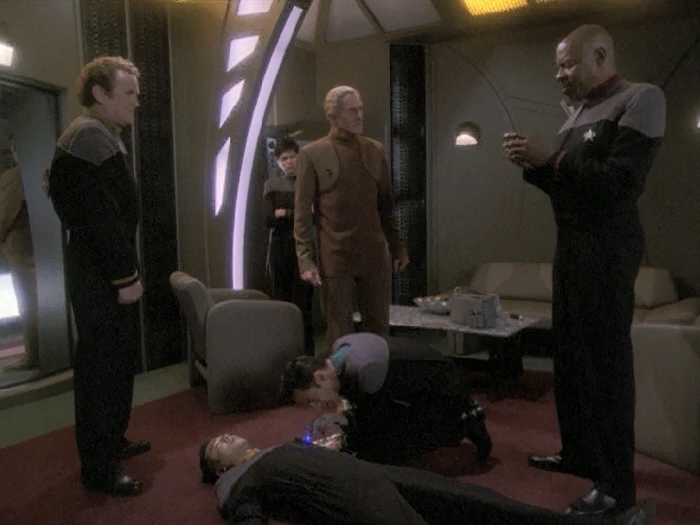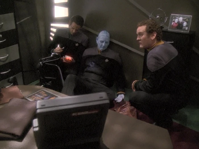 Nachdem alle das Quartier verlassen haben, durchsucht Ezri den Raum. Sie findet in einem Fach ein PADD, scheint aber nichts Interessantes dabei zu finden. Unterdessen will Joran wissen, ob der Mörder so lange Offiziere erschießen wird, bis es niemanden mehr gibt, wenn sie ihn nicht schnappen. Die Trill geht nicht darauf ein, sondern sieht sich weitere PADDs an. Joran schaut sich unterdessen ein Bild von Joran mit seinen Kindern an und fragt gehässig, wie jemand so glücklich mit so hässlichen Kindern sein konnte. Das lässt die Frau aufschrecken und sie fordert den Mann auf, noch einmal zu wiederholen, was er gesagt hat. Daraufhin erklärt Joran, dass er sich das Foto des Mannes angeschaut hatte. Auch Ezri sieht es sich nun an und ihr wird klar, dass das die Lösung sein muss. Sie erklärt, dass es dem Mörder sicher darum geht, dass der Mann auf diesem Foto lacht.