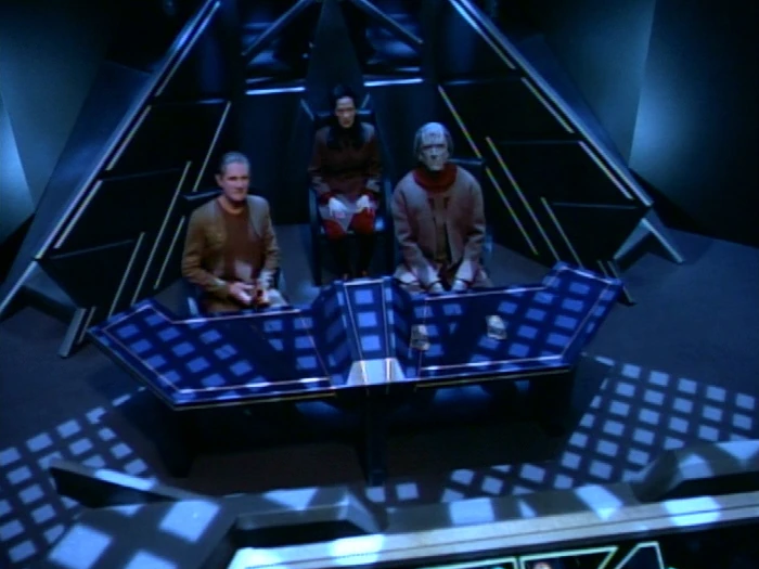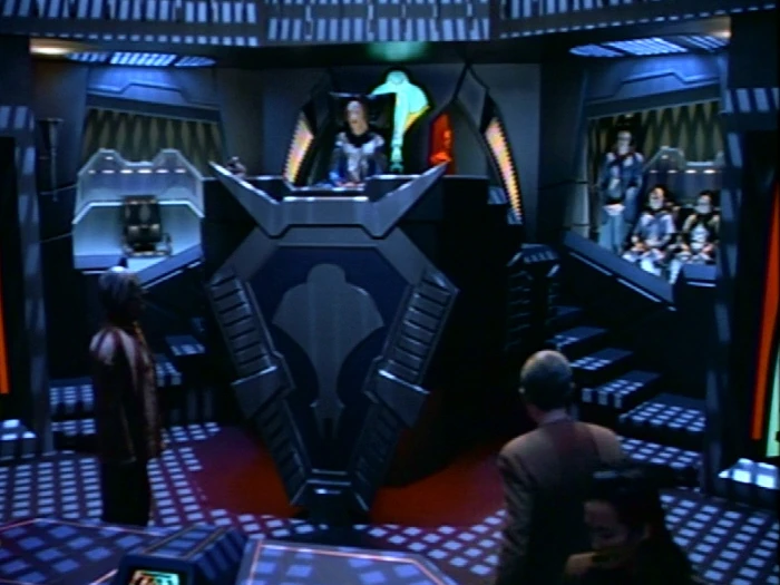 Vor dem Archon nimmt weiter unten im Saal das Verteidigungsteam bestehend aus Konservator und Nestor seinen Platz ein. Dahinter sitzt die Familie des Angeklagten. Der Angeklagte selbst sitzt etwas erhöht hinter seinem Verteidigerteam und seiner Familie in einem schwach beleuchten Bereich des Gerichts. (DS9: Das Tribunal)