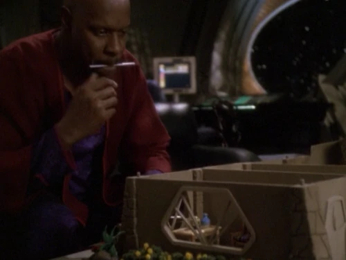 In seiner freien Zeit arbeitet Sisko weiter an dem Modell des Hauses, das er auf Bajor plant. Als er gerade das Dach auf das Modell setzen will, hat er eine Vision.