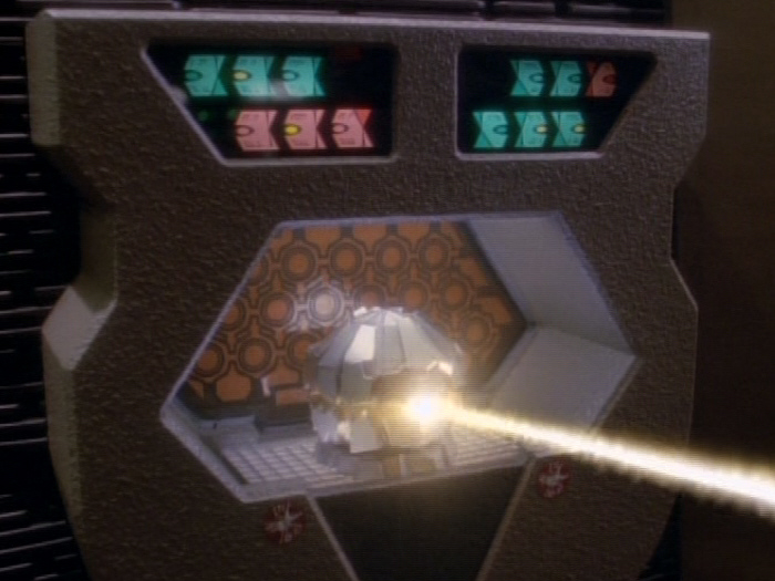 Sogleich erscheint im Replikator der OPS ein kleines Gerät. Dieses beginnt zu schießen. Der erste Schuss schlägt in der Nähe von Dax und Kira ein, der zweite unweit von Bashir und Garak. Das Gerät schießt weiter und der nächste Schuss trifft einen Offizier, der sogleich aufgelöst wird.