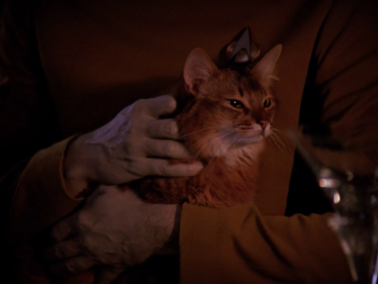 Auf Turkana IV besitzt die junge Tasha Yar eine Katze. Als Yar von Vergewaltigern verfolgt wird, bringt Yar als erstes ihre Katze in Sicherheit. 2364 befindet sich die USS Enterprise (NCC-1701-D) an einem Ort im Universum, an dem Gedanken Wirklichkeit werden, und plötzlich erscheint auch die Katze von Yar wieder. (TNG: Der Reisende)