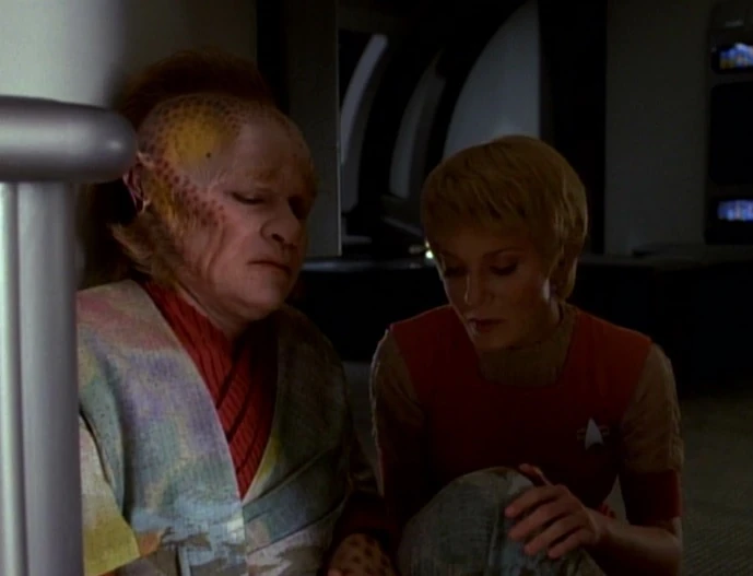 Nach der Flucht aus dem akritirianischen Hochsicherheitsgefängnis kümmert sich Kes um die beiden Verletzten Paris und Kim. (VOY: Das Hochsicherheitsgefängnis)