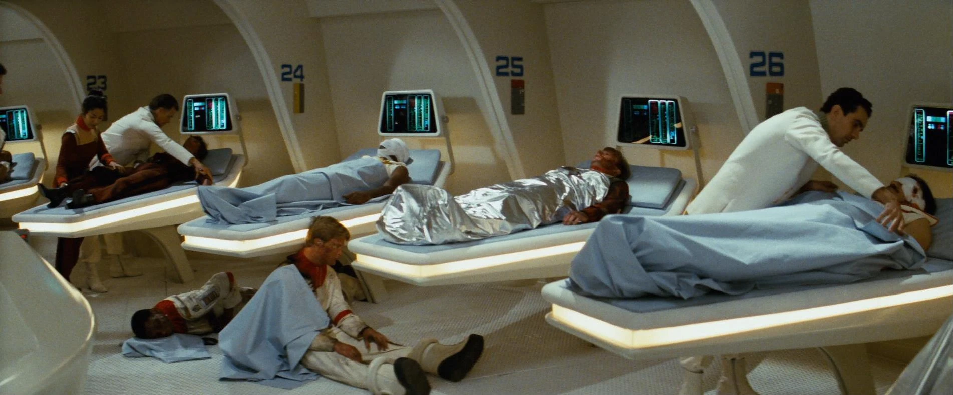 Auch auf Raumschiffen der Föderation werden Triagen bei großen Mengen von Verletzten durchgeführt. Wenn kein Platz mehr für alle Verletzten ist, werden die Verletzten auf dem Boden behandelt. (Star Trek II: Der Zorn des Khan)