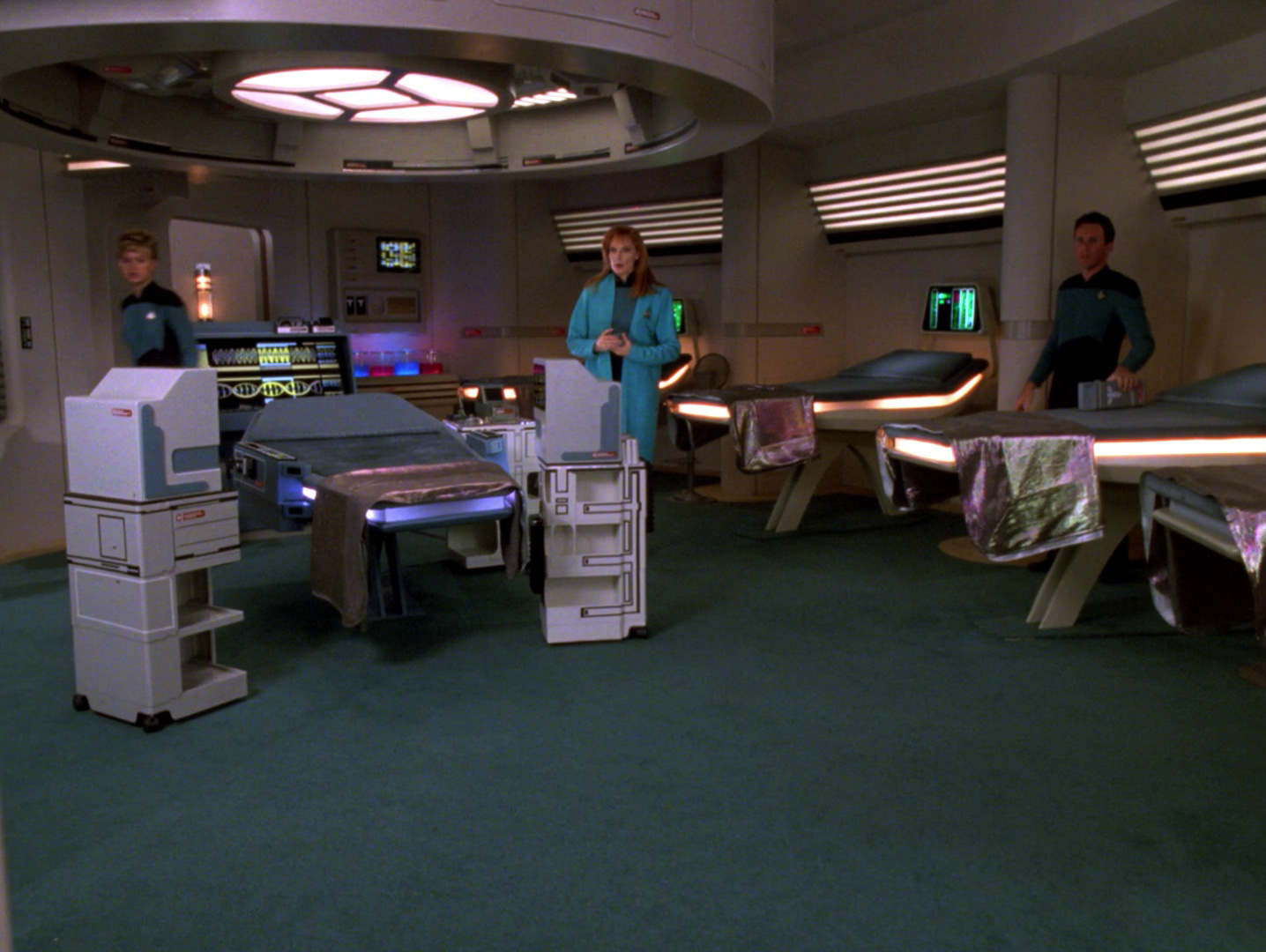 Im Falle der Galaxy-Klasse jedoch liegt die Krankenstation in der Antriebssektion beiderseits in Nähe der Torpedorampen. Im Falle einer Notabtrennung der Untertassensektion muss die Krankenstation evakuiert werden. (Star Trek: Treffen der Generationen)