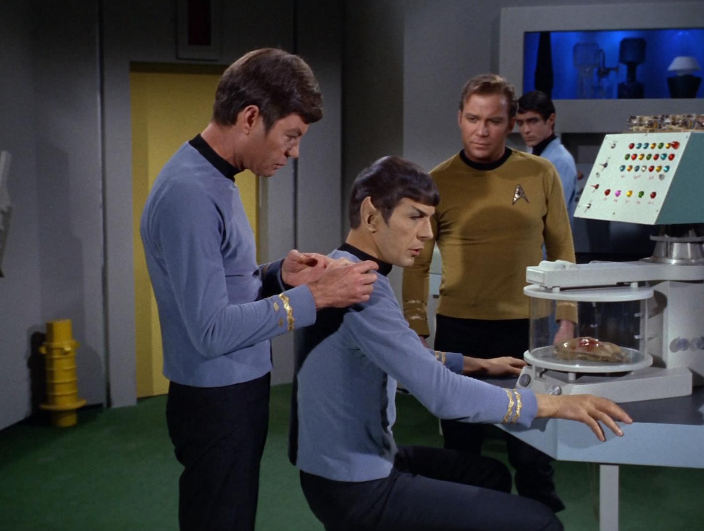 McCoy und Spock untersuchen den Neuralparasiten.