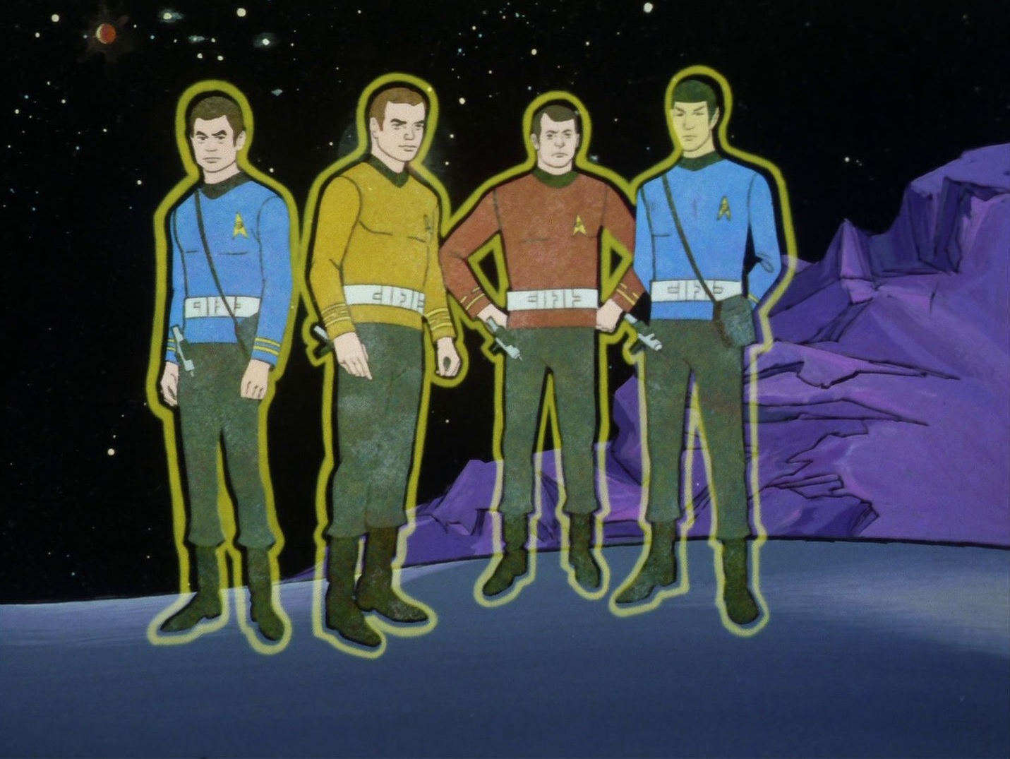 Bei einer Außenmission verschwinden Scott und Sulu auf der Oberfläche Pyris VII. Kirk, Spock und McCoy begeben sich auf die Oberfläche, um nach den Vermissten zu suchen. Die drei finden ein altes Schloss vor und betreten dieses. Dort geraten die drei in eine Falle und wachen gefesselt in einem Burgverlies wieder auf. Die drei sind gefangene von Korob und Sylvia, welche mit ihren Transmutator auch Sulu und Scott unter ihrer Kontrolle halten. Die beiden demonstrieren ihre Macht, als sie auch McCoy mit ihrem Transmutator in eine willenlose Marionette verwandeln. Später gelingt es Kirk und Spock den Transmutator zu entwenden und zu vernichten. Dadurch wird die Kontrolle von Korob und Sylvia gebrochen und die beiden kommen ums Leben, während McCoy, Sulu und Scott ihren freien Willen zurück erlangen. (TOS: Das Spukschloss im Weltall)