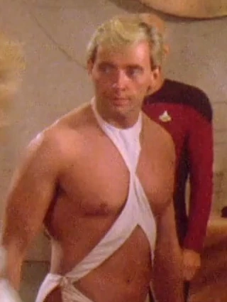 Kurz bevor der Enterprise-Landetrupp erstmals auf Rubicun III beamt, steht dieser Edo-Mann bei einer Gruppe um Rivan und Liator. (TNG: Das Gesetz der Edo)