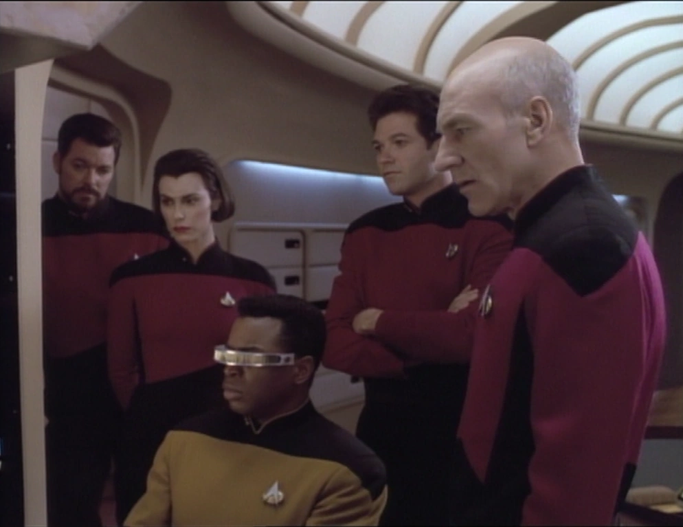 Commander Riker und Fähnrich Ro Laren streiten unterdessen um ein neues Verfahren zur Berechnung der Flugbahn, das sie ohne ihn zu fragen ausführte. Er kritisiert vor allem ihre Ignoranz gegenüber den Vorschriften an Bord.