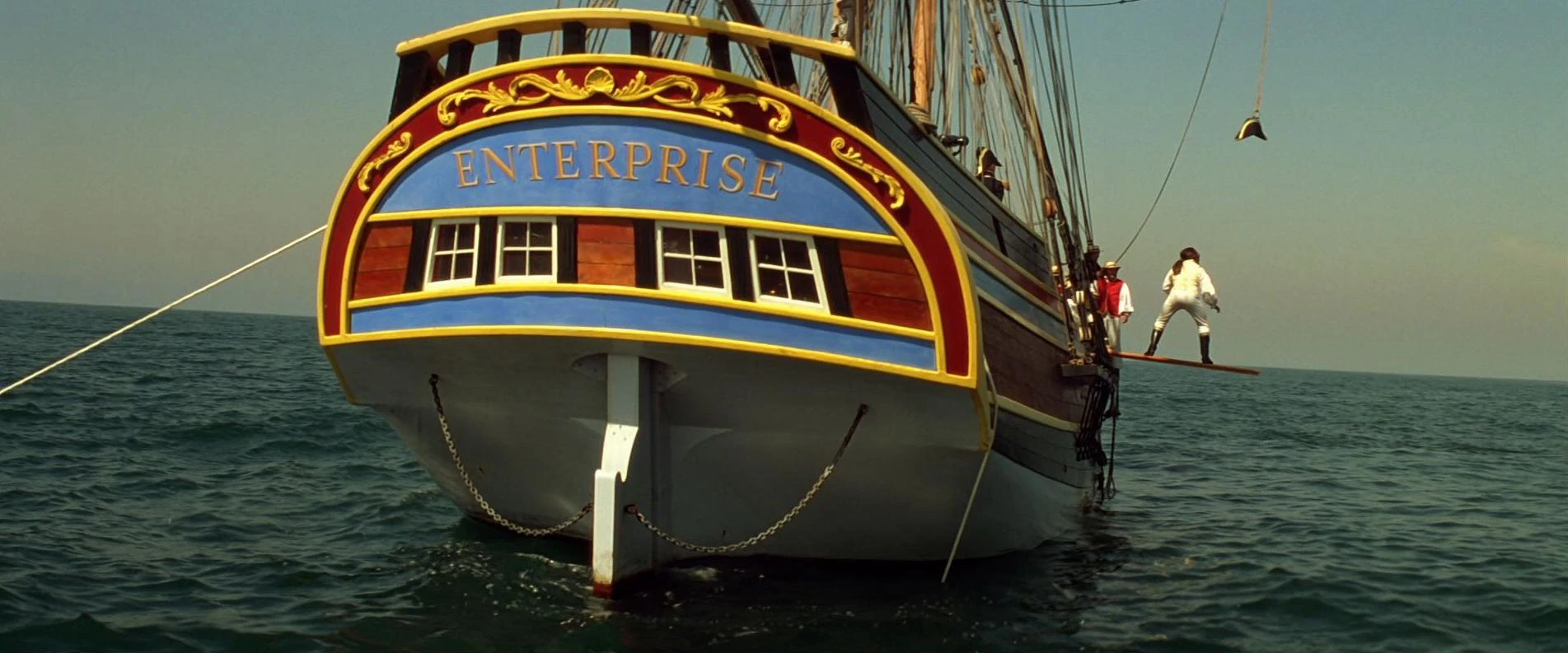 2371 muss Worf sein neues "Rangabzeichen", ein dreieckiger Hut, über die Planke der USS Enterprise erreichen. Der Hut hängt an einem Seil direkt über der Planke. Worf springt von der Planke und schafft es, den Hut zu ergreifen und wieder sicher auf der Planke zu landen. Allerdings befiehlt Commander William T. Riker dem Computer, die Planke zu "entfernen", woraufhin sie verschwindet. Worf fällt somit direkt ins Wasser. (Star Trek: Treffen der Generationen)