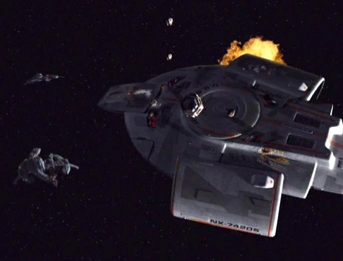 Nachdem die USS Enterprise (NCC-1701-E) ins Jahr 2063 zurück gereist ist, um zu verhindern, dass die Borg die Geschichte verändern, wird das Schiff von den Borg übernommen. Als Captain Jean-Luc Picard erkennt, dass er die Borg nicht besiegen kann, aktiviert er die Selbstzerstörung des Schiffes und die Besatzung wird mit Fluchtkapseln auf die Erde evakuiert. (Star Trek: Der erste Kontakt)