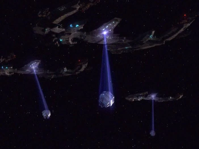 Bei der Schlacht von Wolf 359 flieht die Besatzung der USS Saratoga, darunter auch Lieutenant Commander Benjamin Sisko, mit Fluchtkapseln, als das Schiff explodiert. (DS9: Der Abgesandte, Teil I)