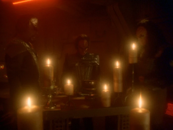 In Worfs Quartier auf der Rotarran küssen sich Dax und Worf. Plötzlich meldet sich Captain Sisko bei der Trill. Beide halten ein und Dax bestätigt die Anfrage. Nun erklärt Sisko, dass sie in fünf Minuten bei Sternenbasis 375 sein werden. Dax entgegnet, dass sie sich im Transporterraum sehen werden. Dann erklärt sie, dass es ein schlechtes Timing ist und teilt Worf mit, dass sie nun gehen muss. Anschließend beginnen sie sich erneut zu küssen. Doch da die Pflicht ruft, geht die Trill zu ihren Sachen und packt ihre Tasche. Nun will Worf mit ihr reden. Die Frau entgegnet, dass sie nichts dagegen hat, solange es nicht um ihre Hochzeit geht. Doch zum Leidwesen der Frau entgegnet Worf, dass sie nicht vergessen darf, Martok ihr D'k tahg zu präsentieren, wenn sie ihre Schwüre ablegen, um die formelle Bitte vorzutragen, in sein Haus aufgenommen zu werden. Allerdings entgegnet Dax, dass sie gar nicht vorhat, dem Haus beizutreten. Worf reagiert mit Unverständnis. Doch mit ernstem Gesicht stellt Dax klar, dass sie nicht in all die Blutfehden verwickelt werden möchte, da sie sonst jedes Mal, wenn ein Mitglied des Hauses des Martok getötet oder entehrt wird, alles stehen und liegen lassen müsste, um zu irgendeiner Racheaktion zu eilen. Die Frau findet das langweilig. Entsetzt entgegnet Worf, dass das eine große Schande wäre und General Martok das nicht verstehen würde. Nun klärt Dax den Klingonen auf, dass alles nur ein Scherz war. Um sicher zu gehen, fragt Worf nun, ob sie dem Haus beitreten will. Dax entgegnet, dass sie das natürlich machen will. Nun erklärt Worf, dass ihr Leben nicht einfach werden wird. Doch Dax ist sich sicher, dass sie zumindest viel Spaß haben werden. Dann küssen sich die beiden erneut innig.