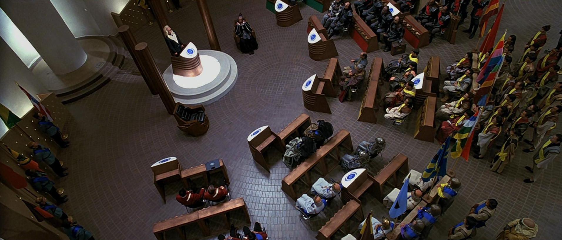 Während der Konferenz verlässt ein Klingone (in der Specialedition enthüllt: kein Klingone, sondern ein Mitglied von Cartwrights Stab) den Sitzungssaal und begibt sich in einen höhergelegenen Raum.