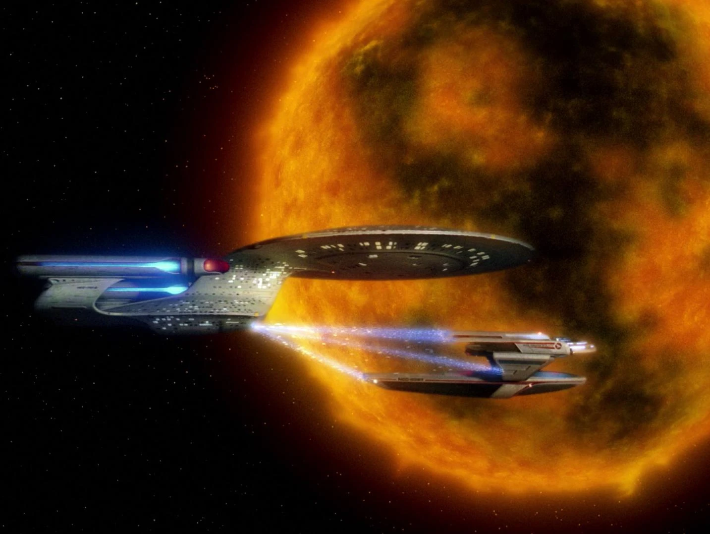 2367 zieht die Enterprise mit Hilfe des Traktorstrahls einen Strahlen verseuchten Frachter aus dem Orbit von Gamelan V und bringt den Frachter durch das System bis es in der Sonne des Systems gefahren los explodiert. (TNG: Die letzte Mission)