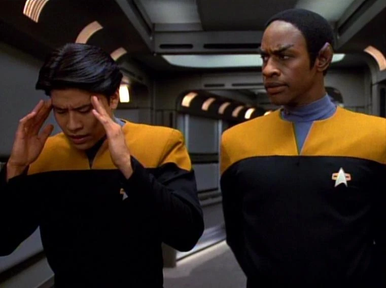 Tuvok will formelle Anklage erheben, weil B'Elanna Torres Lieutenant Joseph Carey schwer verletzt hat. Chakotay möchte dies gerne selbst erledigen, denn beim Maquis werden manche Dinge anders erledigt. Tuvok weist ihn darauf hin, dass sie nicht mehr beim Maquis sind. Und wenn Torres nicht bestraft wird, dann gebe das ein schlechtes Beispiel und man könne meinen, Chakotay bevorzuge die Maquis. Chakotay befiehlt ihm den Vorfall zu vergessen. Tuvok akzeptiert den Befehl, behält sich aber vor, einen Eintrag in das Sicherheitslogbuch zu machen. Später sprechen Harry Kim und Tuvok über den Vorfall im Maschinenraum. Harry hat gehört, dass es dort kurz vor der Meuterei steht. Tuvok ist erstaunt über die Übertreibungen der Menschen, man könne die Situation als angespannt betrachten. Plötzlich hat Harry Kim starke Kopfschmerzen und Sehstörungen und Tuvok bringt ihn zur Krankenstation. (VOY: Die Parallaxe)