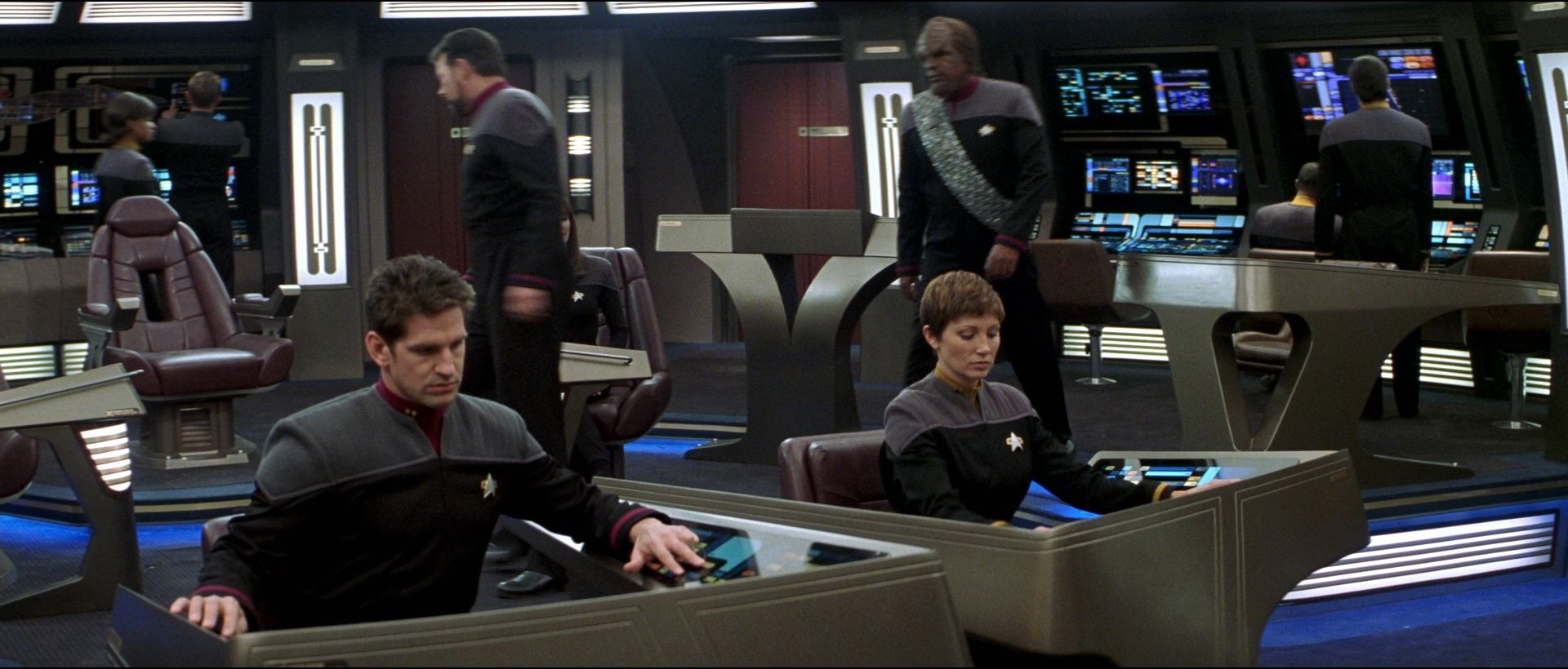 - Lieutenant Commander Worf wird nach der Zerstörung der Enterprise-D für den Zeitraum von 2372 bis 2375 auf die Raumstation Deep Space 9 versetzt. Dort fungiert er als neuer Offizier für strategische Operationen. Als die USS Defiant unter seinem Kommando im Kampf gegen die Borg schwer beschädigt und evakuiert wird, ist er kurzzeitig Teil des Kommandostabs der Enterprise-E. Er kehrt aber dann nach DS9 zurück, jedoch führt ihn sein Weg regelmäßig auf die Enterprise-E zurück. (DS9: Der Weg des Kriegers, Teil I; Star Trek: Der erste Kontakt; Star Trek: Der Aufstand)