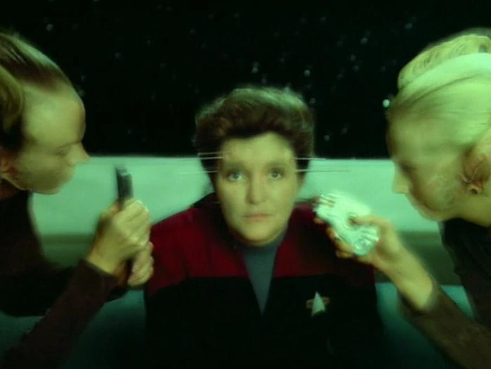 Als Seven durch die Korridore des Schiffes geht, nimmt sie Apparaturen an einigen Crewmen und fremde Humanoide wahr. Als sie den Turbolift betritt, folgt ihr ein Fremder und untersucht sie mit einem Gerät. Sie lässt sich jedoch nichts anmerken. Als sie das Casino betritt, entdeckt sie weitere Fremde, die an der Crew Experimente durchführen. Sie geht am Tresen vorbei und holt sich eine Tasse Kaffee. Daraufhin kontaktiert sie den Doktor und informiert ihn, dass die fremden Wesen überall sind. Dieser weist sie an, den Captain darüber zu informieren.