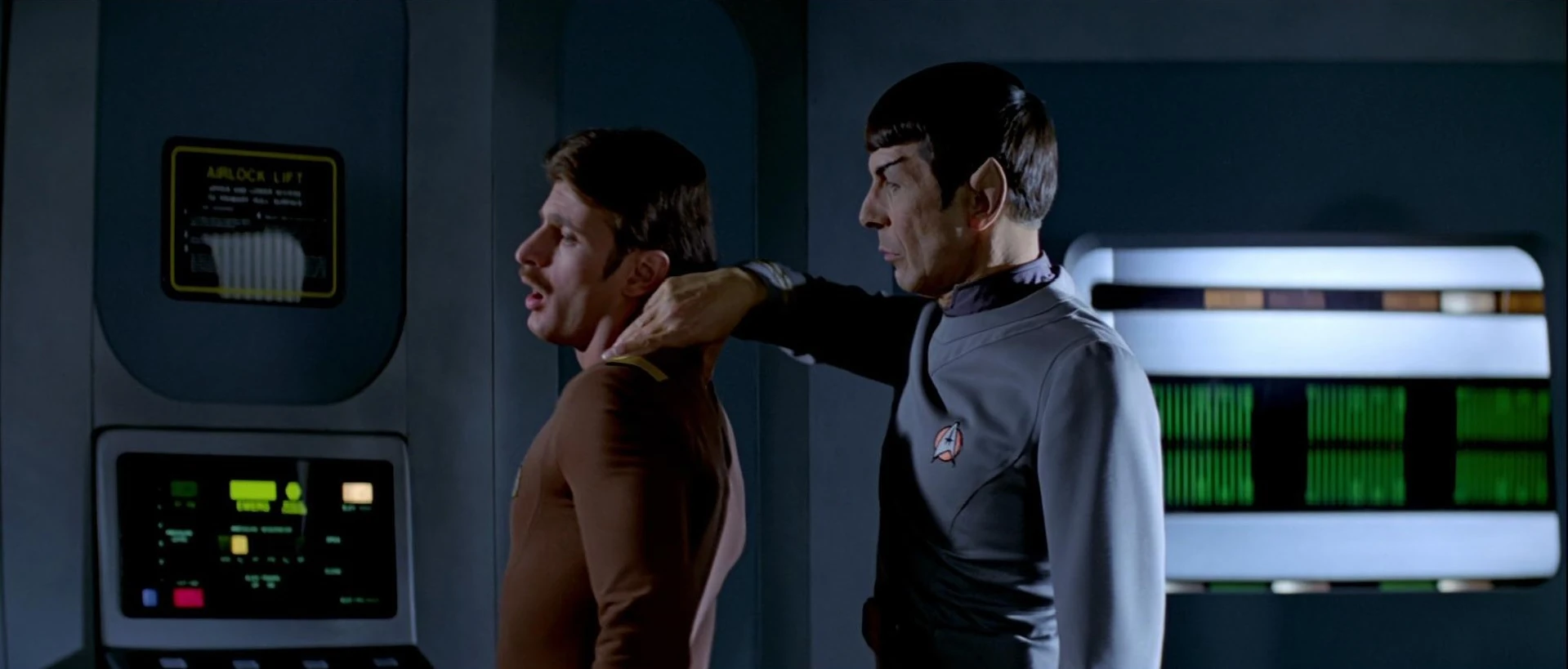 Spock betäubt einen Offizier in der Luftschleuse der Enterprise.