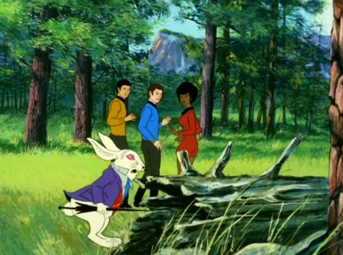 Das weiße Kaninchen springt an Sulu, McCoy und Uhura vorbei (2269)