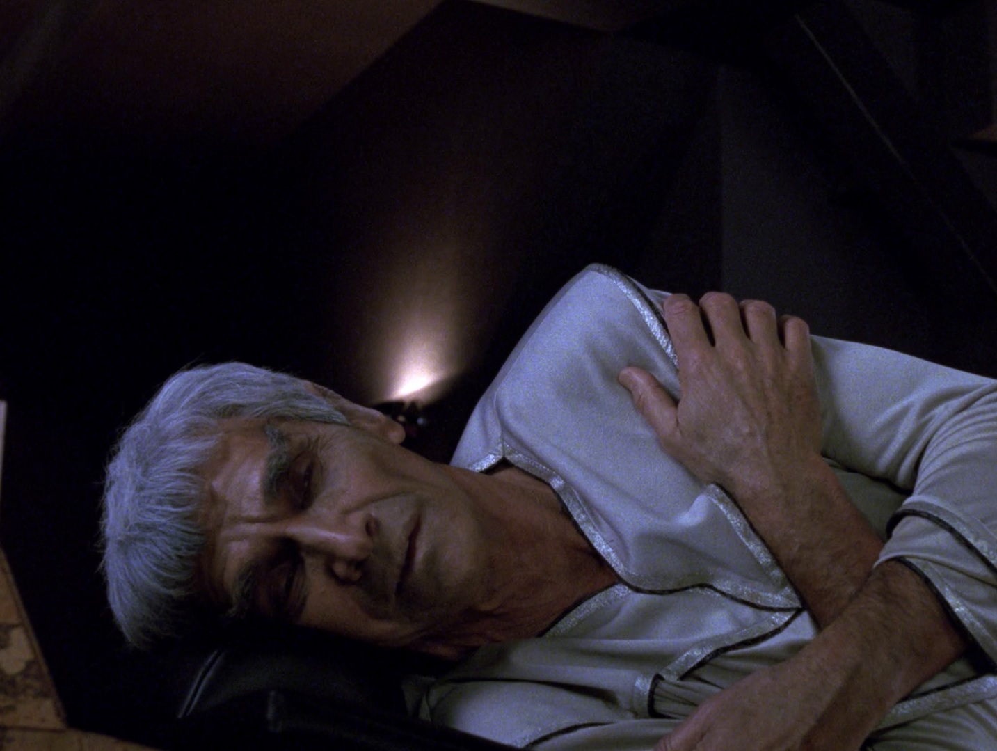 Sonderlich bequem ist es für Data und Picard auf dem klingonischen Schiff nicht. Doch brauchen sie sich die Schlafpritsche nicht zu teilen, weil Data einfach über Nacht stehen bleibt. Aber es fällt dem Captain schwer zu schlafen, während Data einfach nur nichts macht. Dann werden die beiden auf die Brücke gebeten. Es wurde eine Subraumnachricht aufgezeichnet: Sarek ist gestorben.