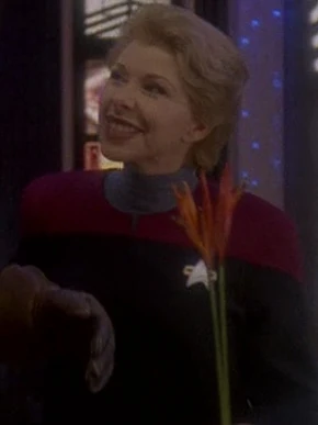 Diese Angehörige der Sternenflotte wartet im Jahr 2373 an einem Nahrungsreplikator auf dem Promenadendeck der Raumstation Deep Space 9 auf ihre Verabredung Morn. Der große Lurianer begrüßt die Frau mit zwei einzelnen Blumen, wofür sie sich mit einem Kuss auf die Wange ihres Verehrers bedankt. Anschließend gehen beide Arm in Arm ihres Weges. (DS9: Die Reise nach Risa)