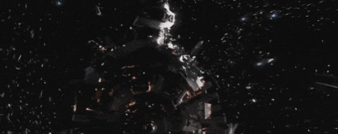 El platillo, choca varias veces con las montañas antes de entrar a un valle donde finalmente se estampa en el suelo y de forma inclinada se incrusta en el valle . Mientras en el cielo caen pedazos de la Enterprise y las naves enjambre.