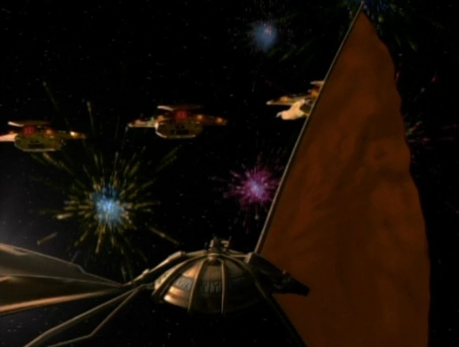Naves cardassianas dan la bienvenida a su espacio a Benjamin Sisko en calidad de Profeta Bajorano