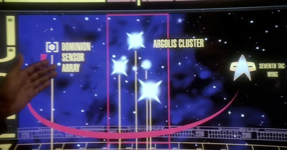 ドミニオン戦争中にドミニオンはアーゴリス星団周辺に大規模なセンサー・アレイを隠した。センサー・アレイは5セクター先で活動する宇宙艦を監視する事が出来て戦略的に相当な利点を提供した。2374年、USSディファイアント(NX-74205)はジャッジア・ダックス少佐指揮の下で星団の中を通ってアレイの破壊に成功した。ドミニオン軍は星団内の極端な重力シアーによって艦が破壊されると考えていた為この方向からの攻撃に備えていなかった。(DS9: レジスタンスの苦悩)