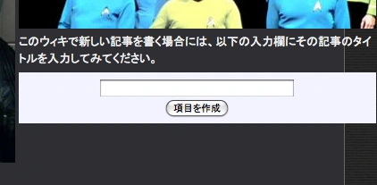 MemoryAlphaでは新規記事の作成方法は二つあります。MemoryAlphaのトップページに、右の図で示しているような文字列を挿入できる空欄とその下に項目を作成というボタンがある箇所を見つけることが出来ると思います。その空欄に記事のタイトルを入力し、項目を作成というボタンを押すと空白の編集画面が現れます。