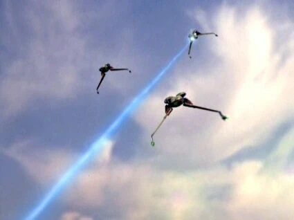 | Drie roofvogels lanceren een aanval op de sterrenbasis |