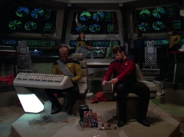 - Het gedeelte van het verblijf van kapitein Picard in "The Battle" is een hergebruik van zijn verblijf op de USS Enterprise-D.