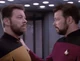 Riker en Picard staan tegenover elkaar in een gevechtssimulatie. | |||