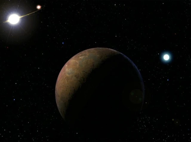 | De planeet Triskelion met haar drie sterren in het M24 Alpha systeem |