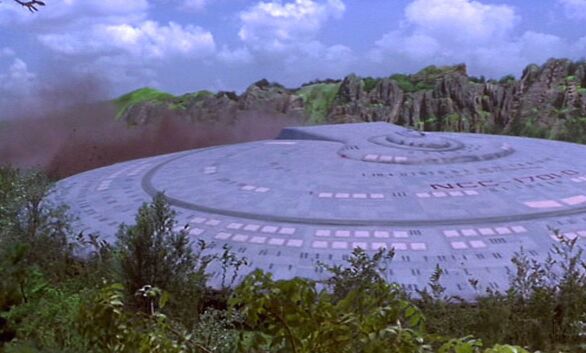 | De schotelsectie van de Enterprise-D, geland op Veridian III |