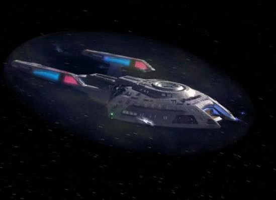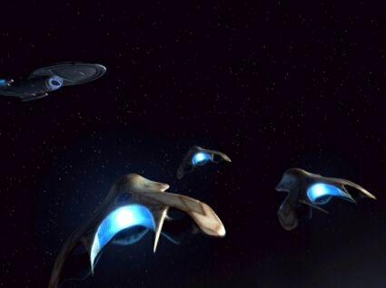 | Drie Monean onderzoeksschepen naderen de USS Voyager |